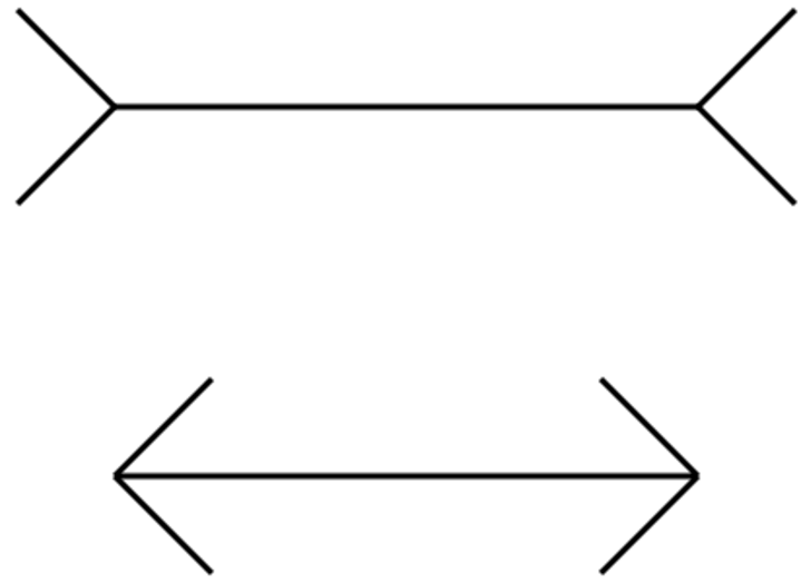 Two horizontal lines, the same length. The top one has diagonal lines going out from its edges. The bottom one has diagonal lines going in from its edges.
